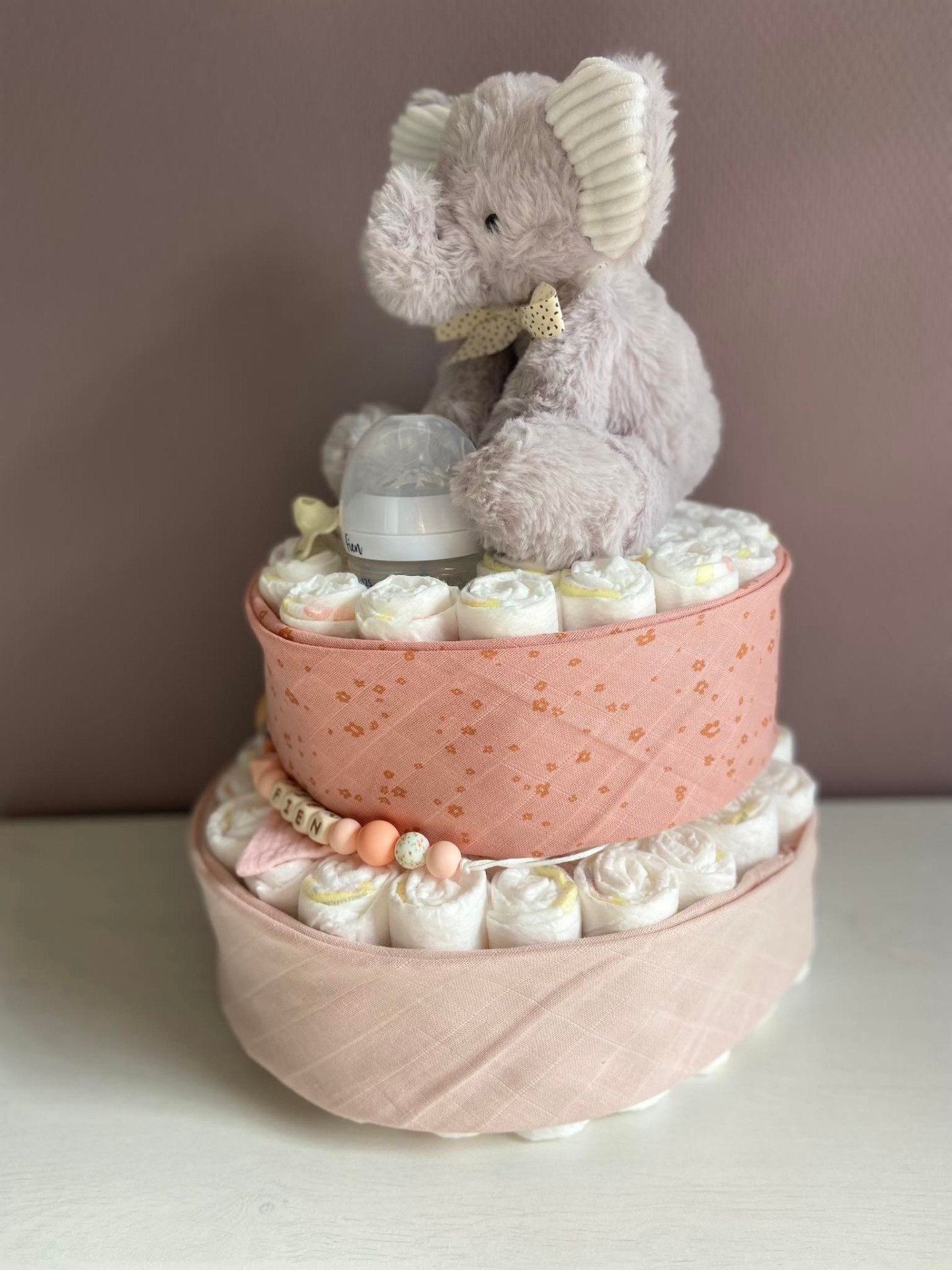 Elke pampertaart is opgebouwd met pampers van het merk 'pampers' maat 3 zodanig je hier nog langer van kunt genieten. Het aantal pampers hangt volledig af van het budget. De opbouw van de taart verschilt bij elke taart afhankelijk van de wensen van de klant en het budget.